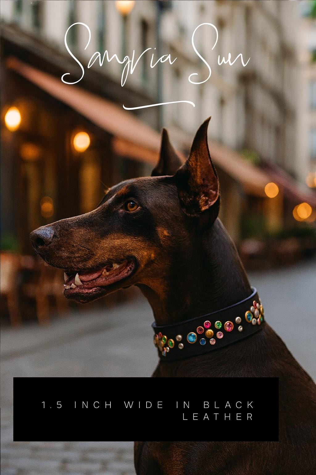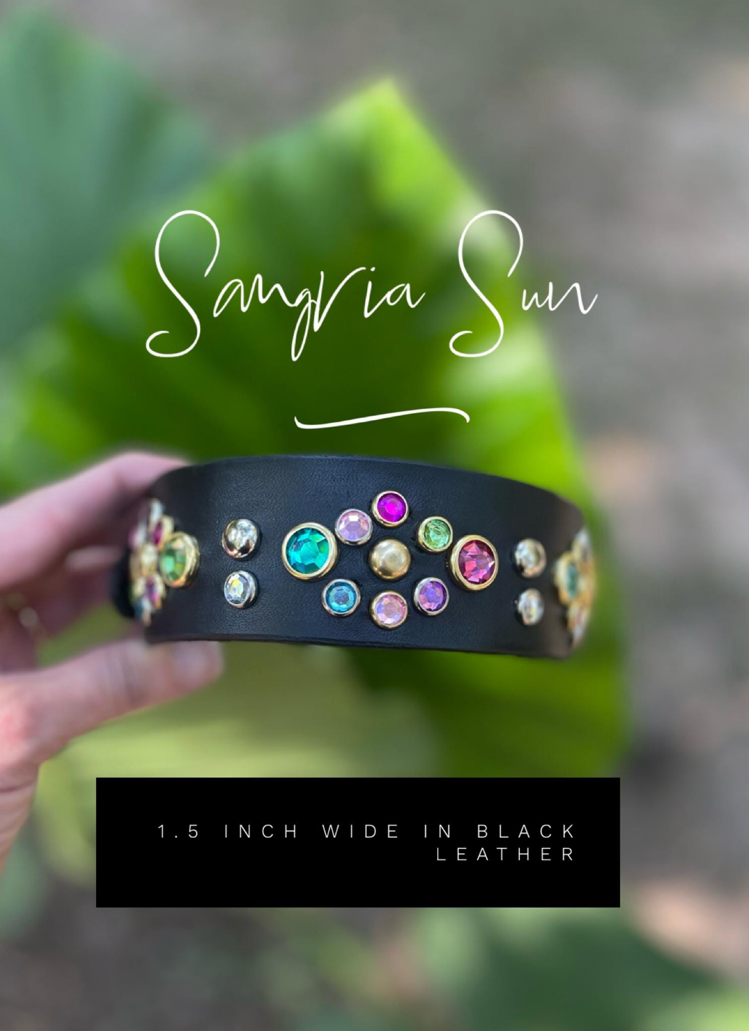 The perfect girly collar for your large, medium or small breed dog! This collar is embellished with a fruitful array of colors, including deep sea turquoise, passion pink, apple green and purple passion rhinestone bling. Yes, this collar is Inspired by the drink itself! The beautiful hues will look awesome on your special fur baby and will be the talk of the town for sure. This collar is hand crafted with premium leather in a deep rich burgundy brown leather (shades may vary slightly), or in luxurious bridle black.