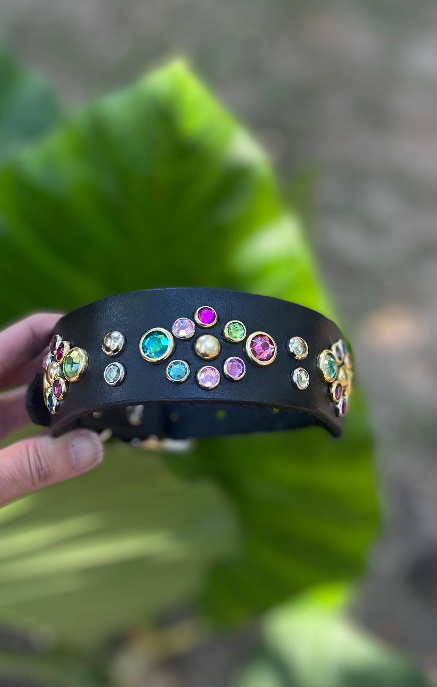 This collar exhibits an array of colorful gems and authentic brass and silver hardware. These collars are very strong, durable and made to last.
