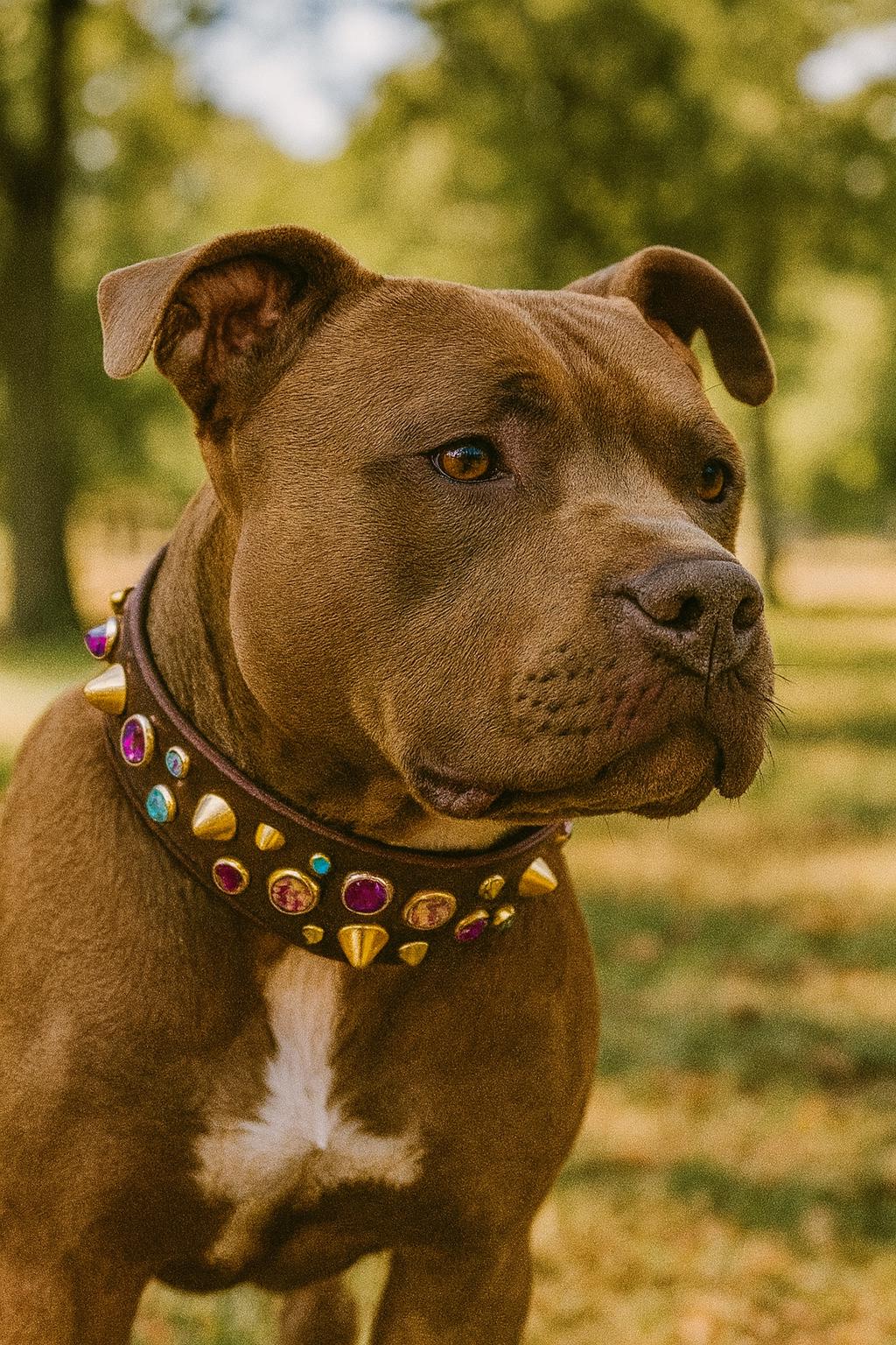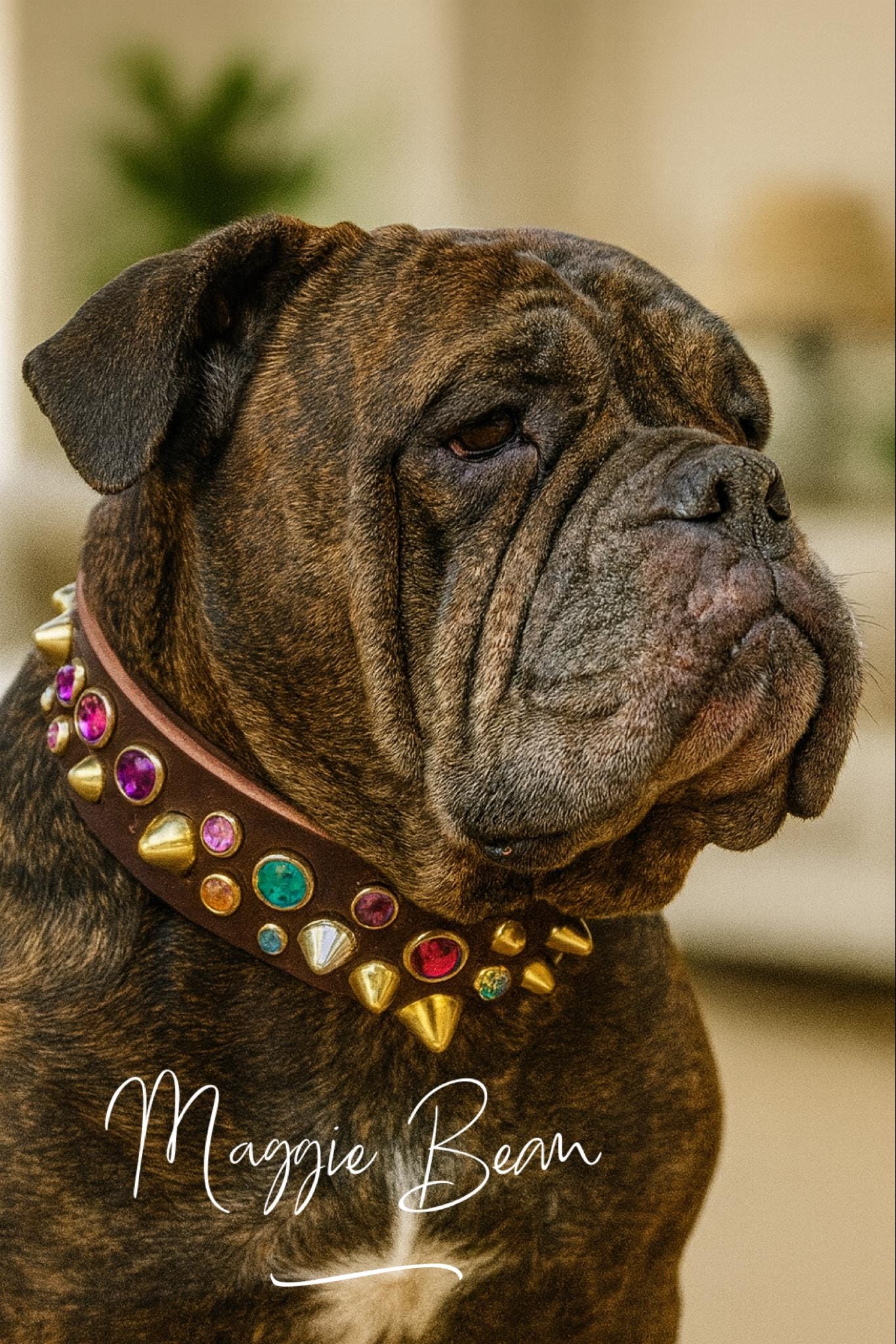 This collar looks stunning on all breeds, both males and females. I can customize your gem color selection and you can put your request under customization. Its great for the dog that wants a bit of a spikey collar but with a little glam and flare. This collar has been a best seller with many of the larger breeds.